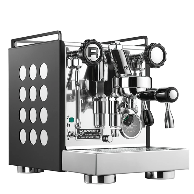 Die Appartamento Siebträgermaschine des Qualitätsherstellers Rocket eignet sich für jeden, der viel Freude an der Zubereitung italienischer Kaffeespezialitäten, dabei jedoch nur wenig Platz in der heimischen Küche hat. Die klassisch gestaltete Maschine fällt durch die runden Ausschnitte an der Seite auf. In der Black/ White Variante sind diese in Weiß gehalten, sodass sie sich von den schwarzen Außenwänden absetzen. Die Front der Maschine selbst ist dabei im klassischen Rocket Stil gehalten. Dank der großen Drehventile im Rocket Design, der no-burn-Dampflanze, sowie dem massiven Siebträgerhalter macht die Appartamento einen äußerst professionellen Eindruck. Den letzten Feinschliff des Designs und der Benutzerfreundlichkeit bilden das Kesselmanometer, sowie der Bezugshebel aus Edelstahl.