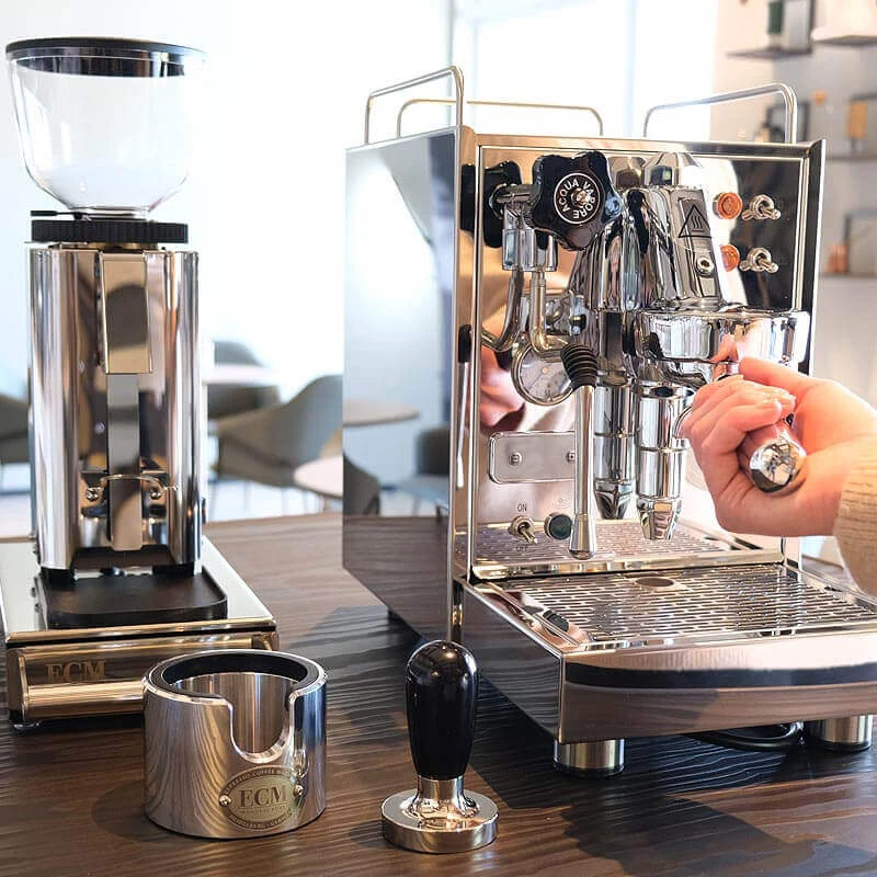 - Vollausstattung von ECM mit Siebträgermaschine, Kaffeemühle, Tamper- und -station und Sudschublade