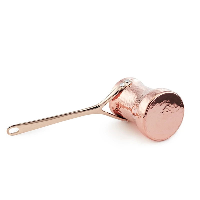 Die Ibriks von Soy werden per Hand aus 1,5 mm dickem Kupfer hergestellt. Das Äußere weist dadurch eine sehr eindrucksvolle und einheitliche Hammerschlagoptik auf. Mit den Cezves vom türkischen Qualitätshersteller Soy aus Istanbul lässt sich türkischer Mokka in seinem vollen Aromaspektrum genießen. Der Handgriff der Ibrik ist aus einer speziellen, eigens geschaffenen Bronzelegierung hergestellt, welche eine zu starke Erhitzung vermeidet und so Verbrennungen vorbeugt.