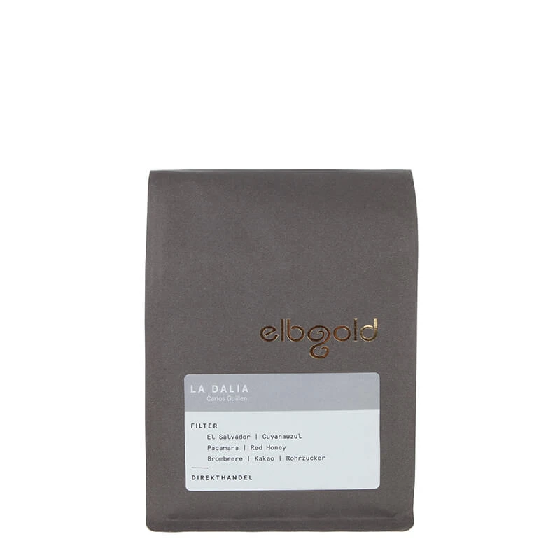 Der Blend El Salvador La Dalia von Elbgold ist ein sortenreiner Arabica Kaffee der Varietät Pacamara. Die Bohnen stammen aus der Region Cuyanuzul in El Salvador. Dort wurde er vor Ort nach dem Red Honey Processing aufbereitet. Geschmacklich zeichnet den Blend eine Mischung der Aromen von Brombeeren, Kakao und Rohrzucker aus.