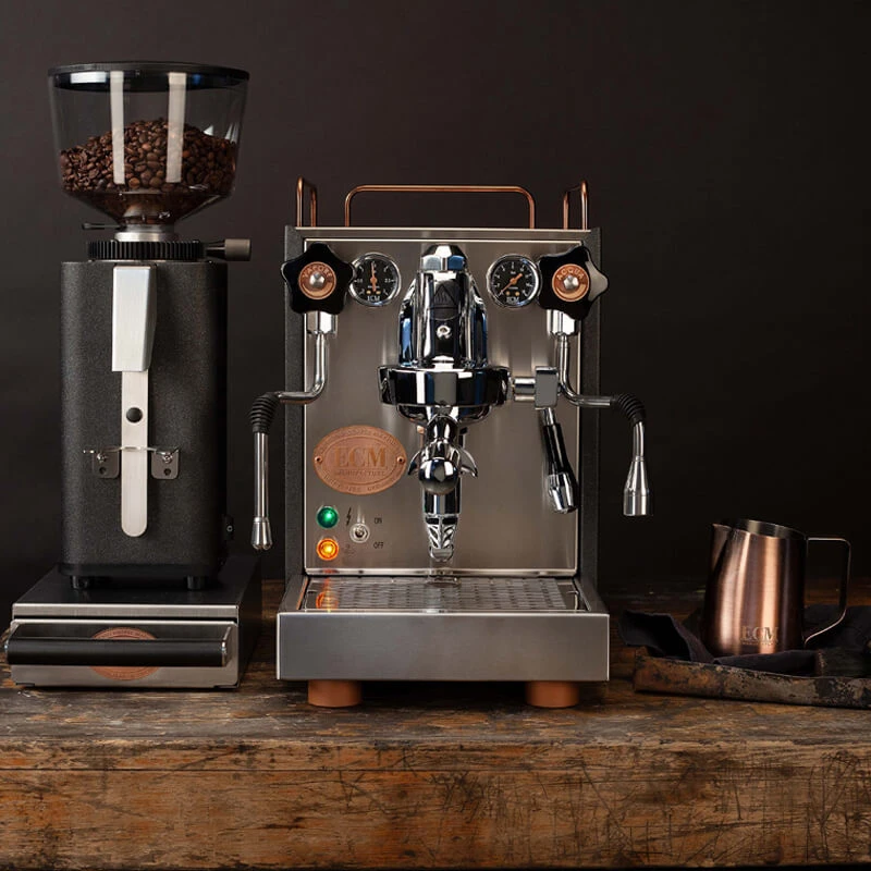Zur Komplettierung des Bundles gehört die ECM S-Manuale 64 Espressomühle. Die 64 mm Mahlscheiben der Mühle bestehen aus Edelstahl. Mit 1400 Umdrehungen pro Minute mahlen diese mit einer Motorleistung von 450 Watt. Das Gehäuse der ECM S-Manuale 64 ist aus elegantem, pulverbeschichtetem Edelstahl. Das ECM Emblem und die Mahlgradeinstellung ist im Retro Kupferlook designed. Die Mahlgradeinstellungen und die dazugehörige Filterauflage sind bei der S-Manuale stufenlos. Der Bohnenbehälter hat ein Fassungsvermögen von 500 g und hat dadurch genug Volumen für die nächsten Kaffeespezialitäten. Im Zusammenspiel mit der Siebträgermaschine und dem dazugehörigen Zubehör im Heritage Look ist das Bundle ein Muss für jede:n Ästhetiker:in.