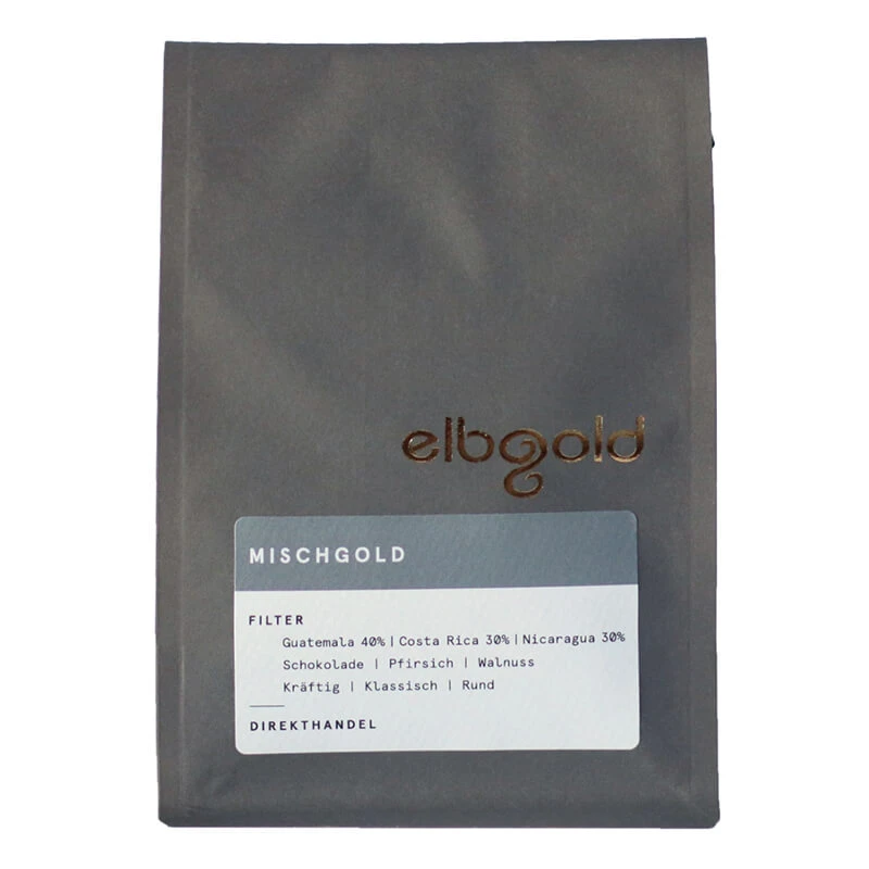 Der Blend Mischgold von Elbgold besteht zu 100% aus Arabica Bohnen. Die hochwertigen Bohnen stammen aus Guatemala, Costa Rica und Nicaragua. Es wurde darauf geachtet, dass sie saisonal geerntet wurden und sie stammen aus Direkthandel. Geschmacklich ist die Röstung super interessant. Denn – nussige Aromen von der Walnuss addieren sich mit Schokolade und fruchtigem Pfirsich.