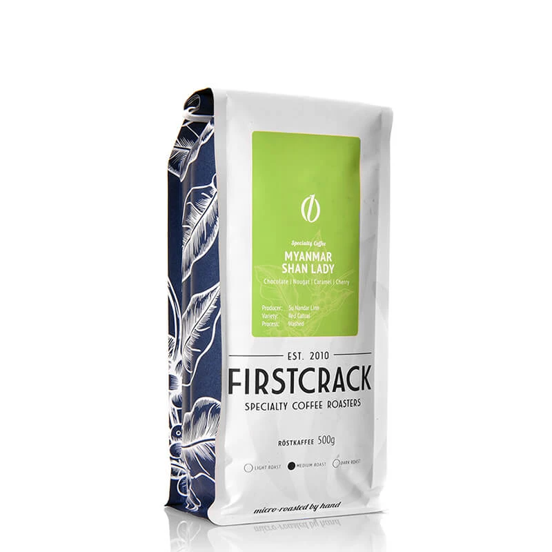 FIRSTCRACK bezieht für die Röstung des Myanmar Shan Lady Rohkaffeebohnen von der Frauenkooperative „The Lady“ aus Ywa Ngan, Shan State in Myanmar. Hier betreibt Su Nadar Linn die Kaffeefarm ihres Vaters, wo Arabica Kaffeepflanzen angebaut und ihre Kirschen aufbereitet werden. Die Kooperative besteht aus der engen Zusammenarbeit mit anderen Farmerinnen der Region. Nachdem die Kaffeekirschen der Sorte Red Catuai von Hand geerntet wurden, werden sie vor Ort gewaschen aufbereitet.