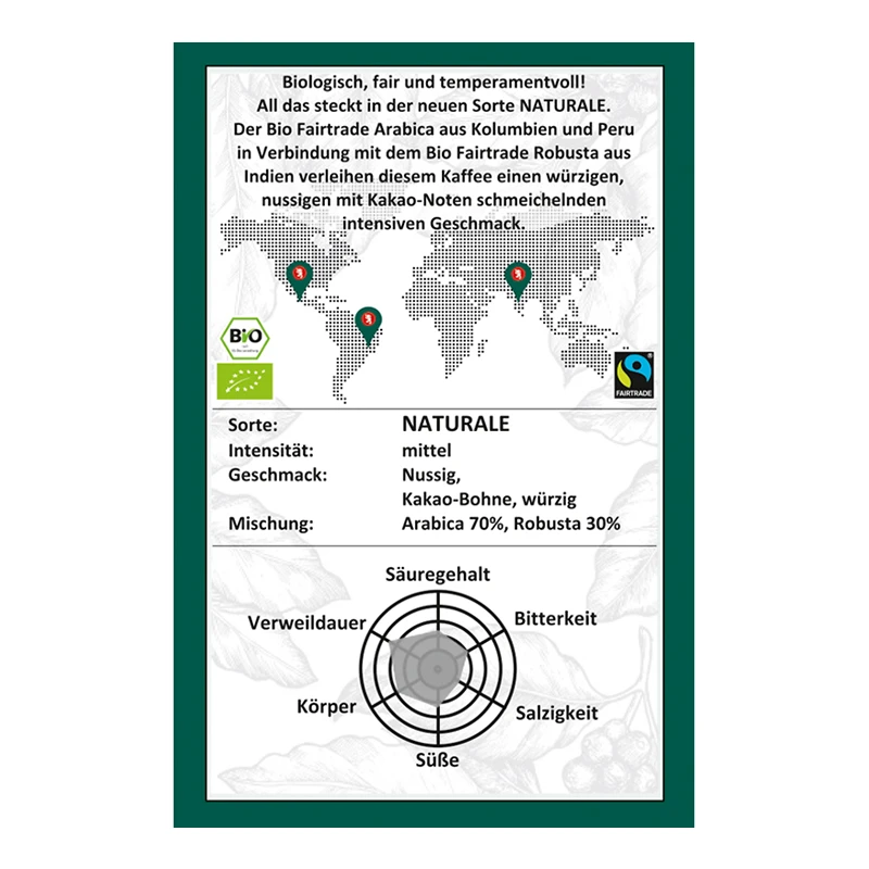 Der Naturale Bio Fairtrade von Mocambo ist eine Mischung aus 70 % Arabica Bohnen und 30 % Robusta Bohnen. Genauer handelt es sich um Excelso EP Huila Bohnen aus Kolumbien, Grade Arabica Bohnen aus Peru und Kerala Robusta Bohnen aus Indien. Der Kaffee ist Fairtrade zertifiziert und die Bohnen wurden unter den strengen Bio Standards angebaut.