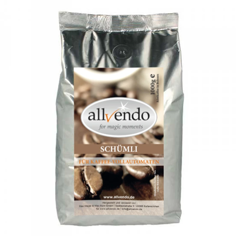 Der Schümli Kaffee von Allvendo ist eine Mischung aus 85 % Arabica Bohnen und 15 % Robusta Bohnen. Die Bohnen wurden schonend in der Trommel geröstet. Daher ist der Kaffee säurearm und harmonisch.